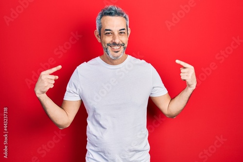 Handsome middle age man with grey hair wearing casual white t shirt looking confident with smile on face, pointing oneself with fingers proud and happy.