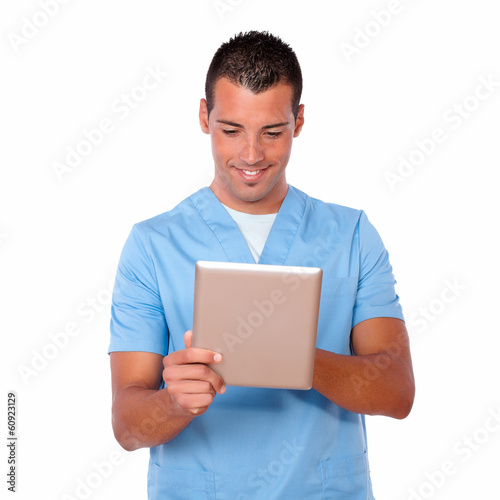 Handsome nurse guy working with his tablet pc