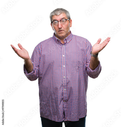 Handsome senior man wearing glasses over isolated background clueless and confused expression with arms and hands raised. Doubt concept.