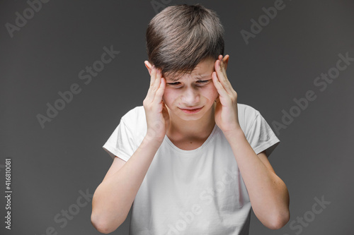 Handsome teenager boy wearing casual white t-shirt standing over isolated background suffering from headache desperate and stressed because pain and migraine. Hands on head.