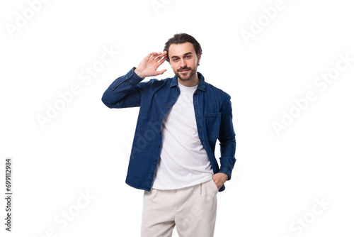 handsome well-groomed young brunette man in a denim shirt on a white background