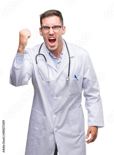 Handsome young doctor man angry and mad raising fist frustrated and furious while shouting with anger. Rage and aggressive concept.