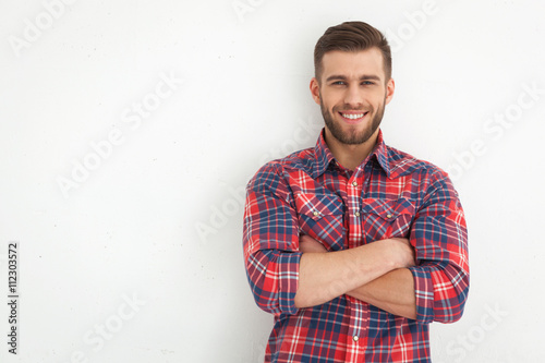 Handsome young guy standing against white wall.