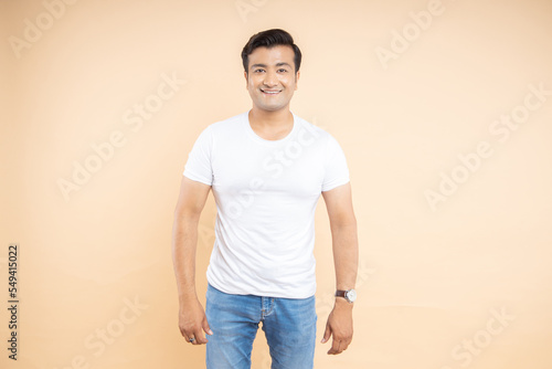 Handsome young indian man wearing white casual t-shirt and jeans. front view of a mockup design print.