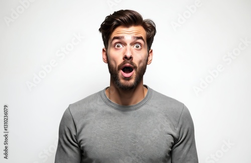 Handsome young man amazed by fake news. Brunet guy looks stylish in casual clothes, jumper. Shocked, surprised model expresses emotion, stares at unbelievable novelty, isolated over grey background.