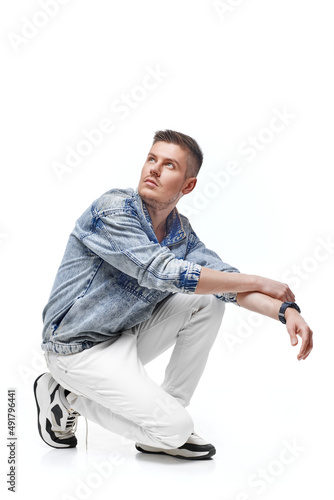 handsome young man in Jean jacket on white background