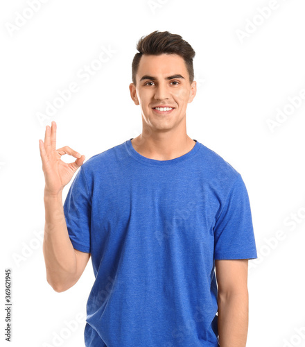 Handsome young man showing OK gesture on white background
