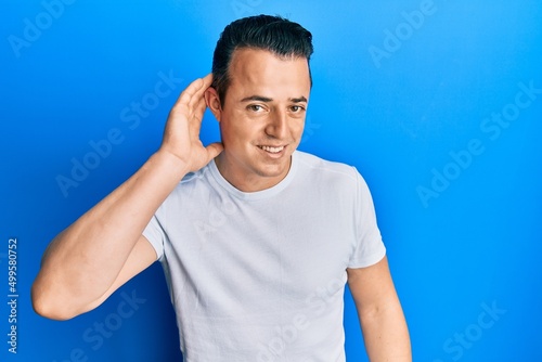 Handsome young man wearing casual white t shirt smiling with hand over ear listening and hearing to rumor or gossip. deafness concept.