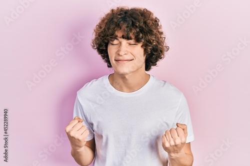 Handsome young man wearing casual white t shirt very happy and excited doing winner gesture with arms raised, smiling and screaming for success. celebration concept.