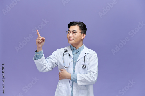 Handsome young man wearing doctor uniform with a smile of face pointing with finger up to the side