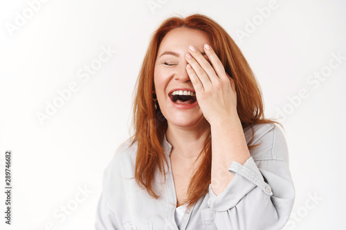 Happiness, aging, beauty concept. Carefree good-looking redhead middle-aged woman laughing cheerful touch face close eyes giggle emotive have fun family circle enjoy retirement, white background
