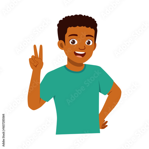 Happy African American Boy Showing Peace Sign with Positive Expression Cartoon Character