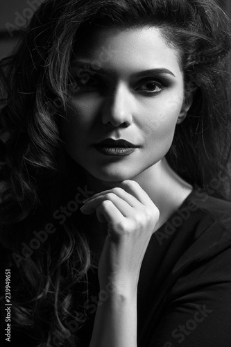 Happy and elegant woman portrait studio shot black and white. Attractive adult brunette sexy girl on black background. Long beautiful healthy hair model girl stock image.