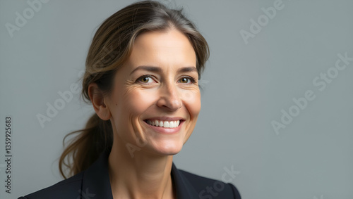Happy and Smiling 50-Year-Old Female Psychologist: Close-Up Headshot of a Sophisticated Businesswoman Isolated on Grey Background for Stock Photo Advertising