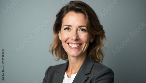Happy and smiling mature 50 year old female psychologist poses for portrait looking at camera. Close up headshot of sophisticated businesswoman isolated on grey background advertising products and ser