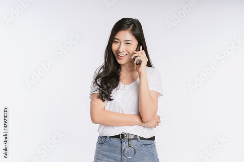 Happy Asian businesswoman using mobile phone isolated over white background. Girl holding the smartphone in a summer t-shirt Short jeans. Copy space