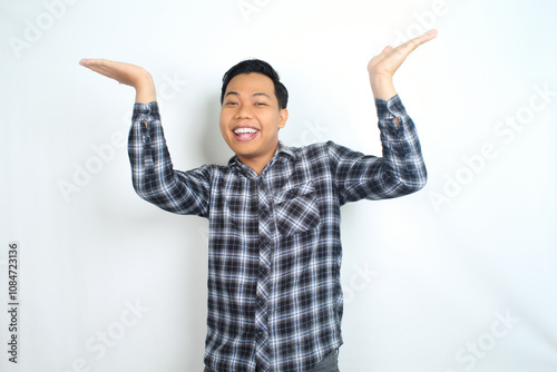 happy asian man presenting hand with smiling face and confident gesture isolated on white backgroun wearing plaid shirt