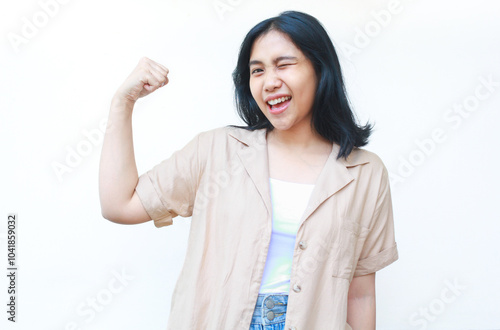 happy asian woman celebrate victory with raised fist wearing casual brown clothes isolated on white background