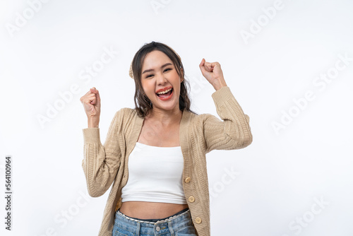 Happy Asian woman is smiling and raise her hands up isolated on white background.