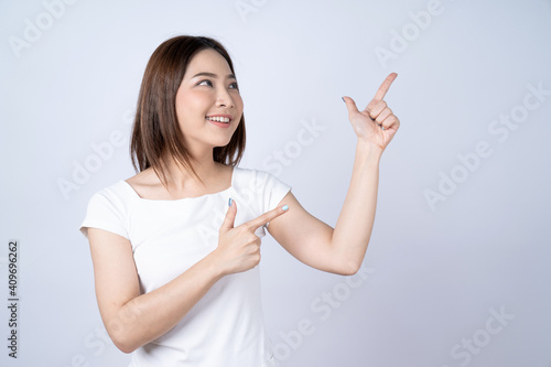 Happy Asian woman pointed to the empty space and looked at the camera, Isolated on white background.