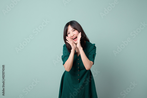 Happy Asian woman shouting above green dress poses against green background blank copy space for advertising content promotion