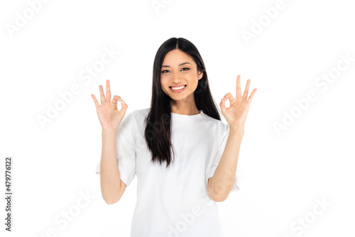 happy asian woman showing okay signs and looking at camera isolated on white.