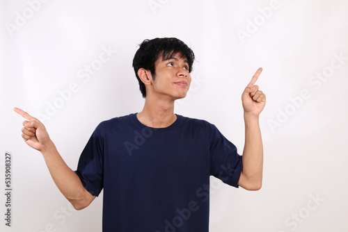 Happy asian young man standing while pointing on both side. Isolated on white background