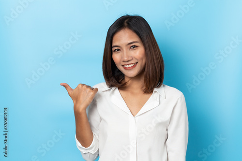 Happy asian young woman smiling against made finger thumbs up OK gesture on blue background