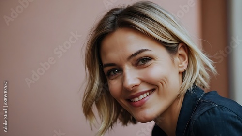 Happy attractive confident young adult or mid aged European woman posing for beauty aesthetic portrait. female model looking at camera. Close up face,copy space