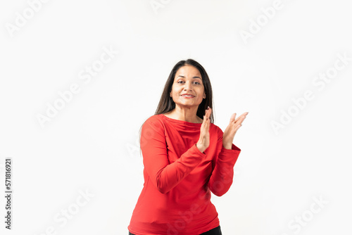 Happy attractive Indian woman laughing and smiling, applauding, clap hands and looking joyful