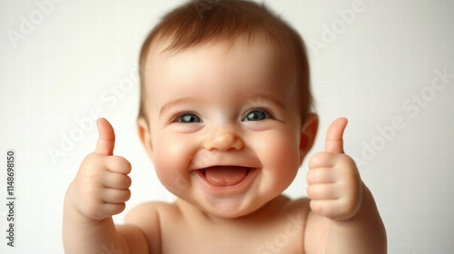 Happy Baby with Cheerful Smile and Thumbs Up Gesture Excels in Expressing Joy and Positivity with Bright Eyes and Soft Hair on Light Background