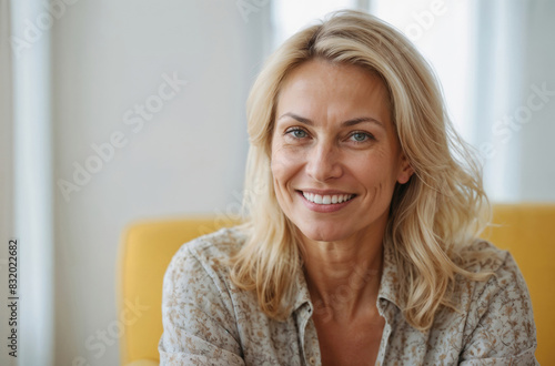 Happy beautiful 50-year-old blond woman sitting at home with copy space