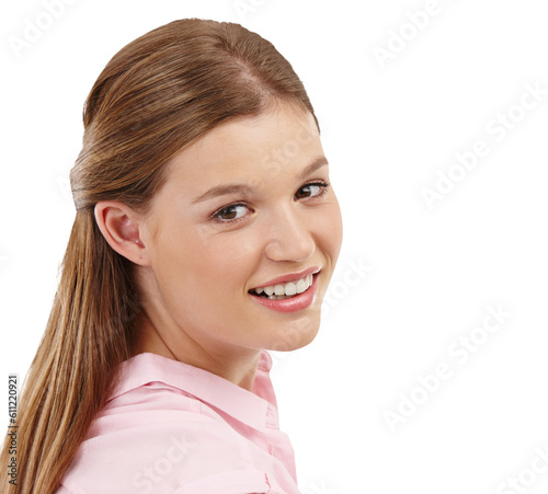 Happy, beautiful and portrait of a woman with a smile isolated on a transparent png background. Confident, face and a young girl with happiness, confidence and empowerment with pride and makeup