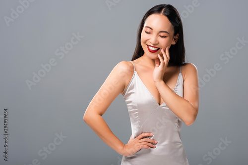 happy beautiful asian woman in satin dress with red lips isolated on grey