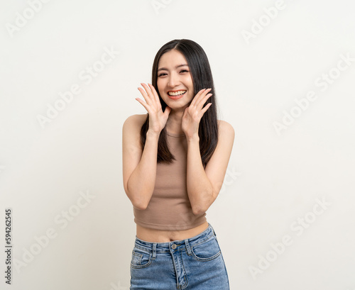 Happy beautiful asian woman with copy space. Excited pretty girl shout out loud wow with hands on mouth announcement standing pose on isolated white background.