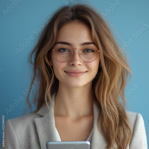 Happy beautiful business woman Young wearing glasses ceo wearing suit standing in office using digital tablet Smiling businessman professional executive manager