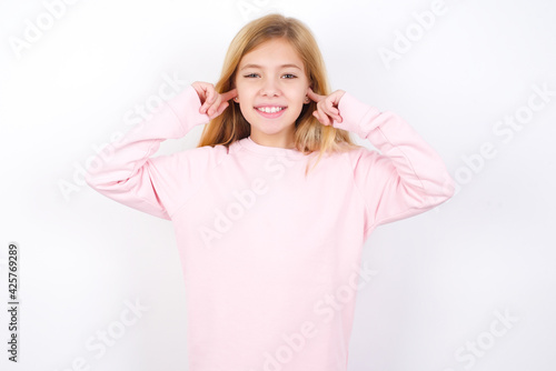 Happy Beautiful caucasian blonde little girl wearing pink sweater ignores loud music and plugs ears with fingers asks to turn off sound