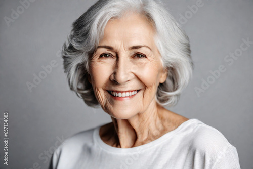 Happy beautiful elderly senior model with grey hair laughing and smiling, closeup portrait of beauty mature old woman with hairstyle and makeup, healthy face skin with wrinkles, dental care