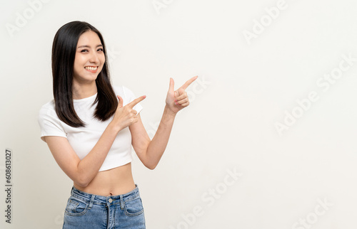 Happy beautiful young asian woman in white shirt pointing finger to copy space. Smiling female lady with blank space. Asian cute Pretty people looking copy space text advertise