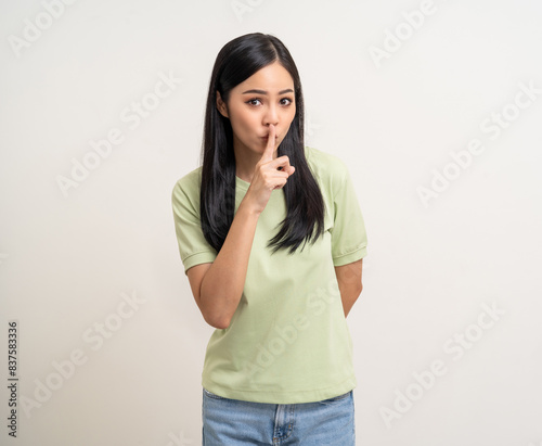 Happy beautiful young asian woman whispering some secret gossip. Excited pretty latin girl index finger on mouth standing pose on isolated white background.