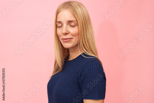 Happy beautiful young woman with freckles and facial piercing posing against blank pink copy space background, keeping her eyes closed, dreaming, imagining something pleasant, smiling joyfully