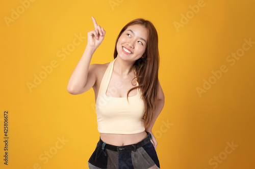 Happy beauty Asian woman looking at copy space. Young Asian woman wearing yellow standing over yellow background. Attractive young woman against yellow background. Carefree happy Asian girl.