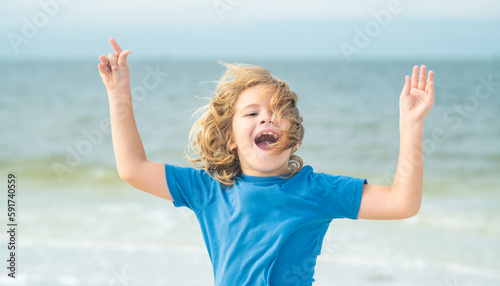 Happy boy enjoys run on beach. Amazed child face. Expressive emotional. Summer portrait of child excited run. Summer mood. Childrens happiness. Boy run at the summer beach. Happy childhood.