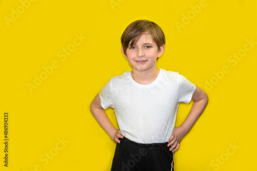 happy boy in sportswear. schoolboy in black and white clothes for physical education. a child in a white t-shirt, black shorts, holds his hands on his waist. positive smiling handsome boy. yellow back
