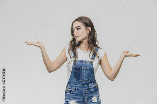 Happy brunette teenager standing on gray background. Dressed in a denim overalls and a white T-shirt. Looking side by side the girl put her hands in different directions, surprised.