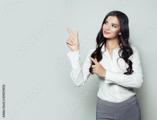Happy business woman pointing her finger to empty copy space for advertising marketing or product placement. Confident business woman portrait