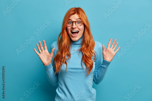 Happy carefree emotions. Excited redhead woman raises palms and looks gladfully at camera screams with happiness dressed in casual clothes isolated on blue background glad to see best friend.