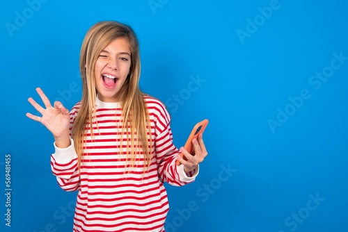 Happy caucasian teen girl wearing striped shirt over blue studio background sending a message on his smartphone or taking a selfie and making ok sign with his hand.