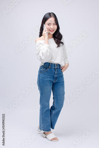 Happy cheerful young asian beautiful woman curly hair wearing long sleeved shirt blue jeans, outfit casual using mobile phone smartphone on white background in studio for social media or video call.