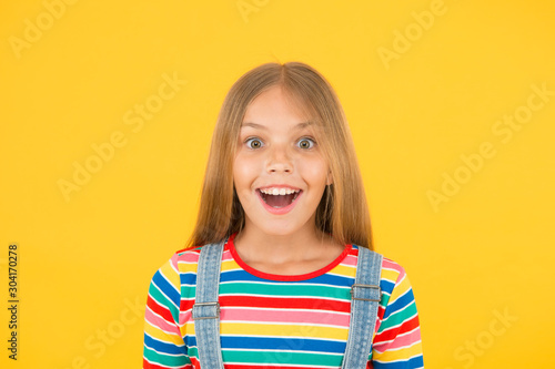 Happy childrens day. childhood happiness. cheerful hipster girl colorful clothes. optimist concept. small girl yellow background. summer kid fashion. kid positive mood. Child happiness portrait